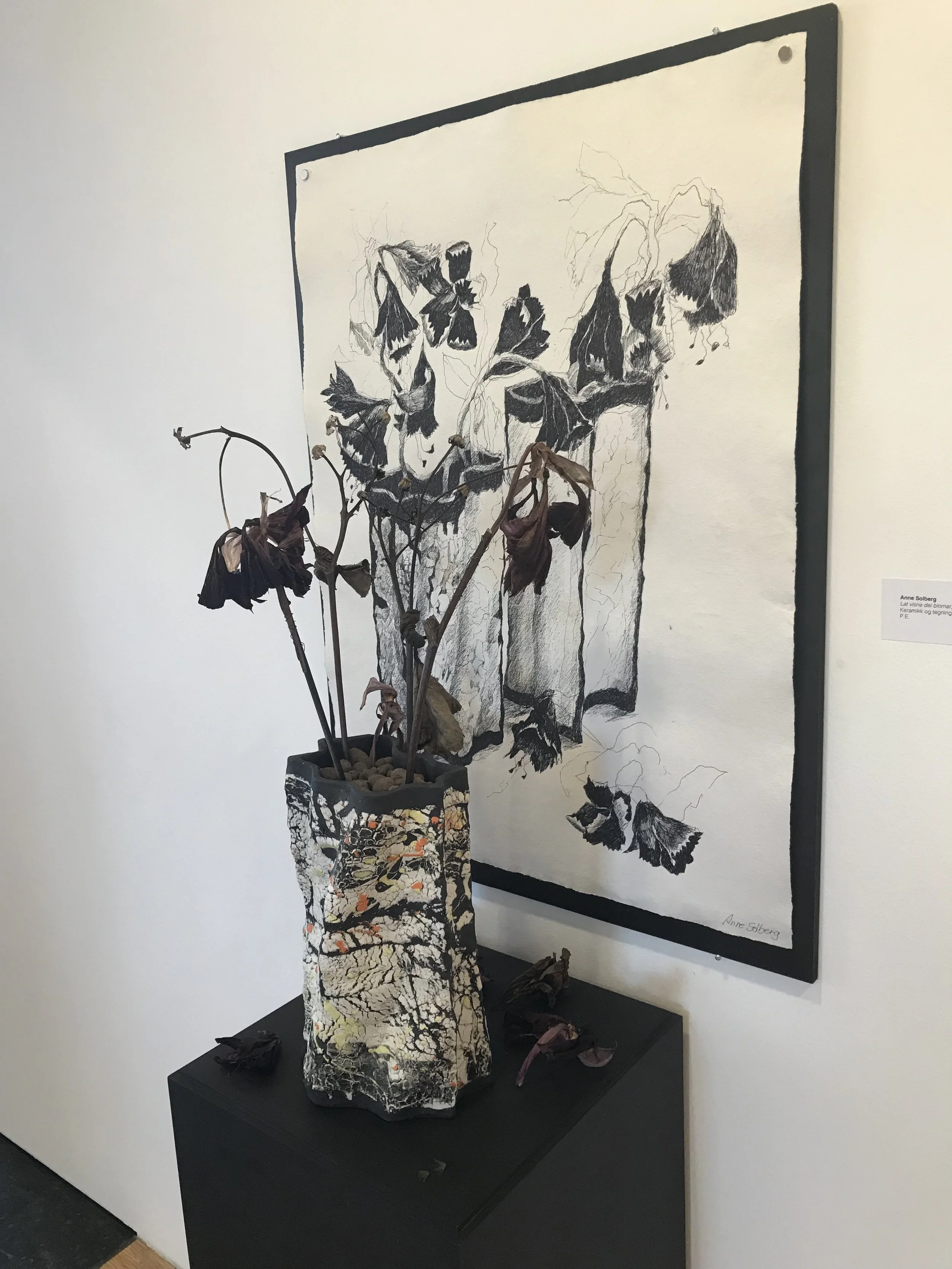 2025. “Let the Flowers Wither”. Urne and withered flowers standing on an ink drawing of the urne and the withered flowers