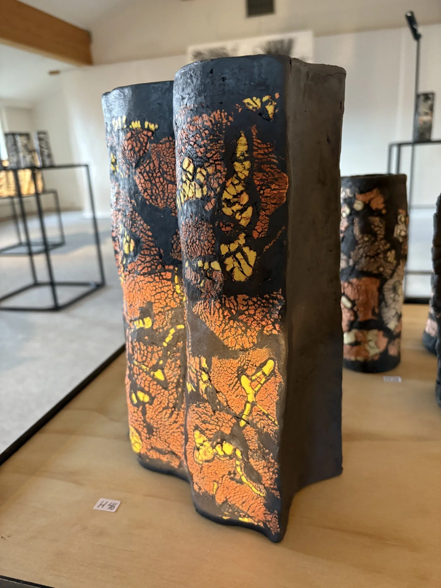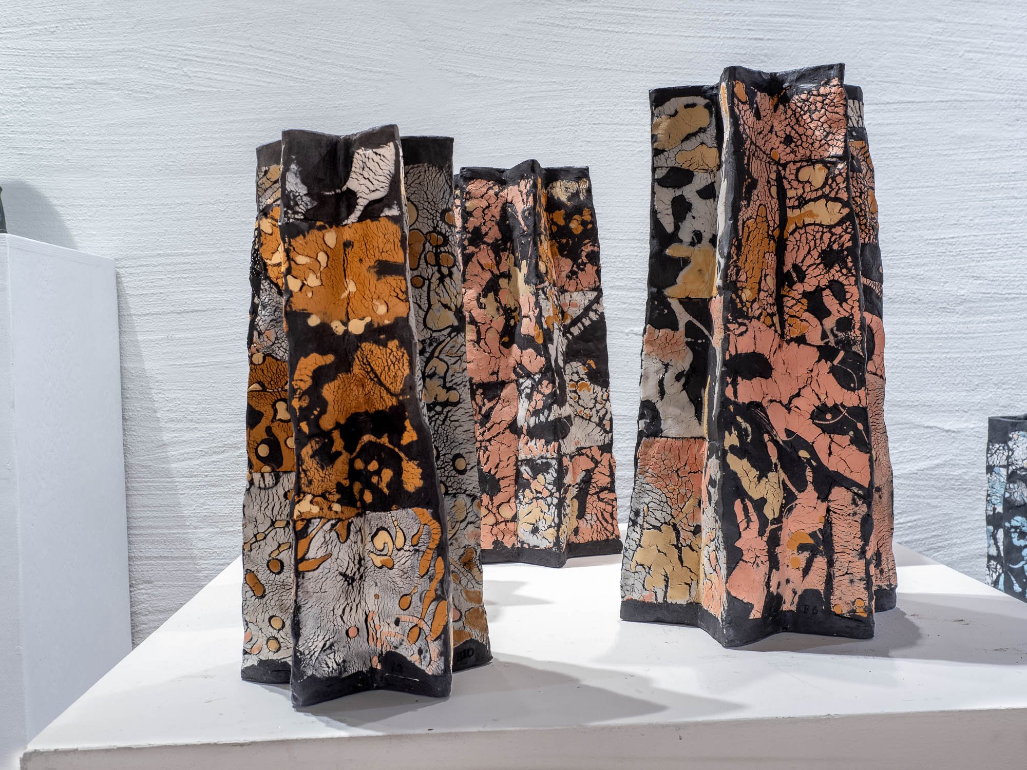 Vases, black stoneware, cracled pink tan and white porcelain coating. Photo: Jon Solberg