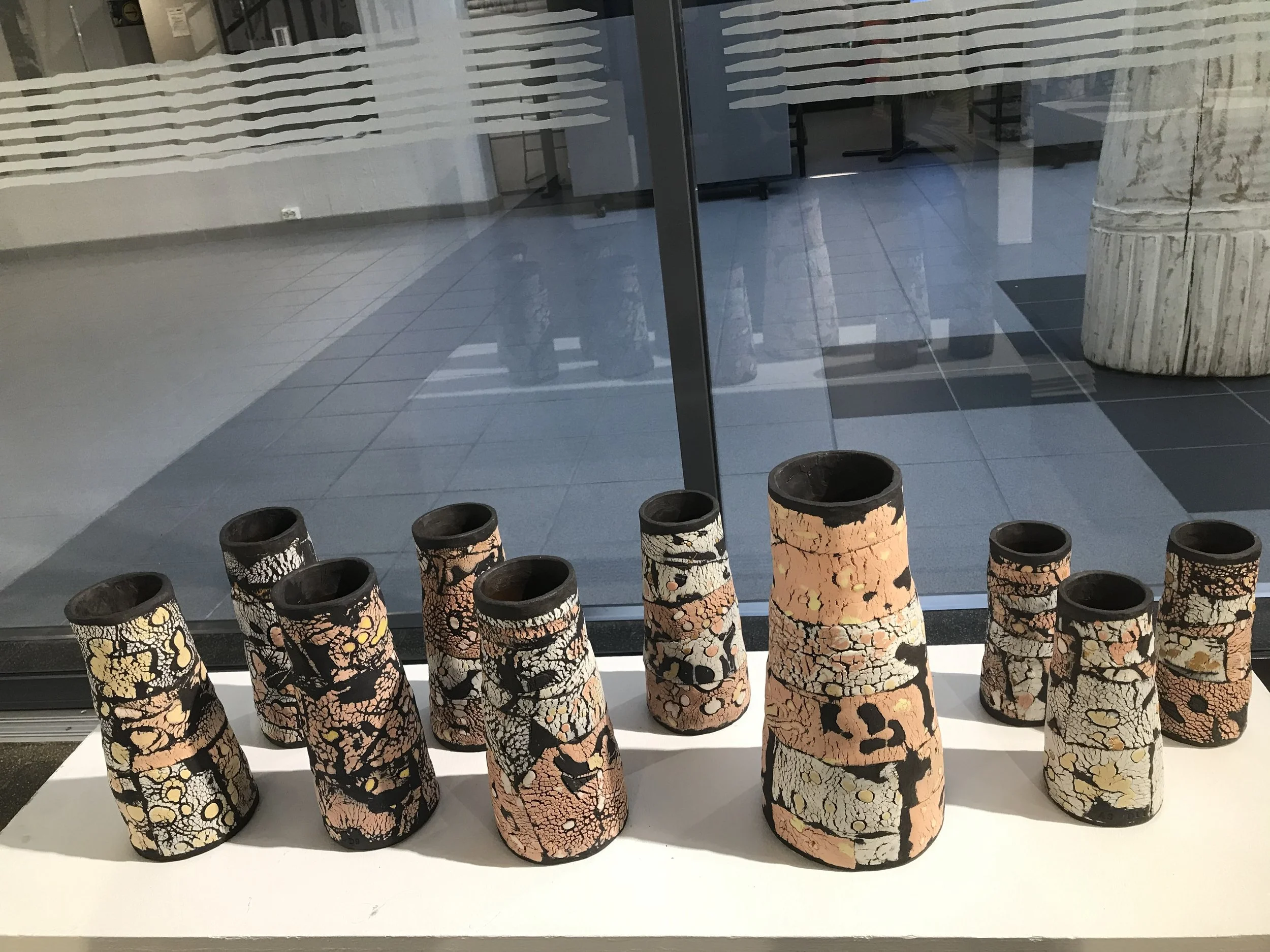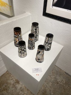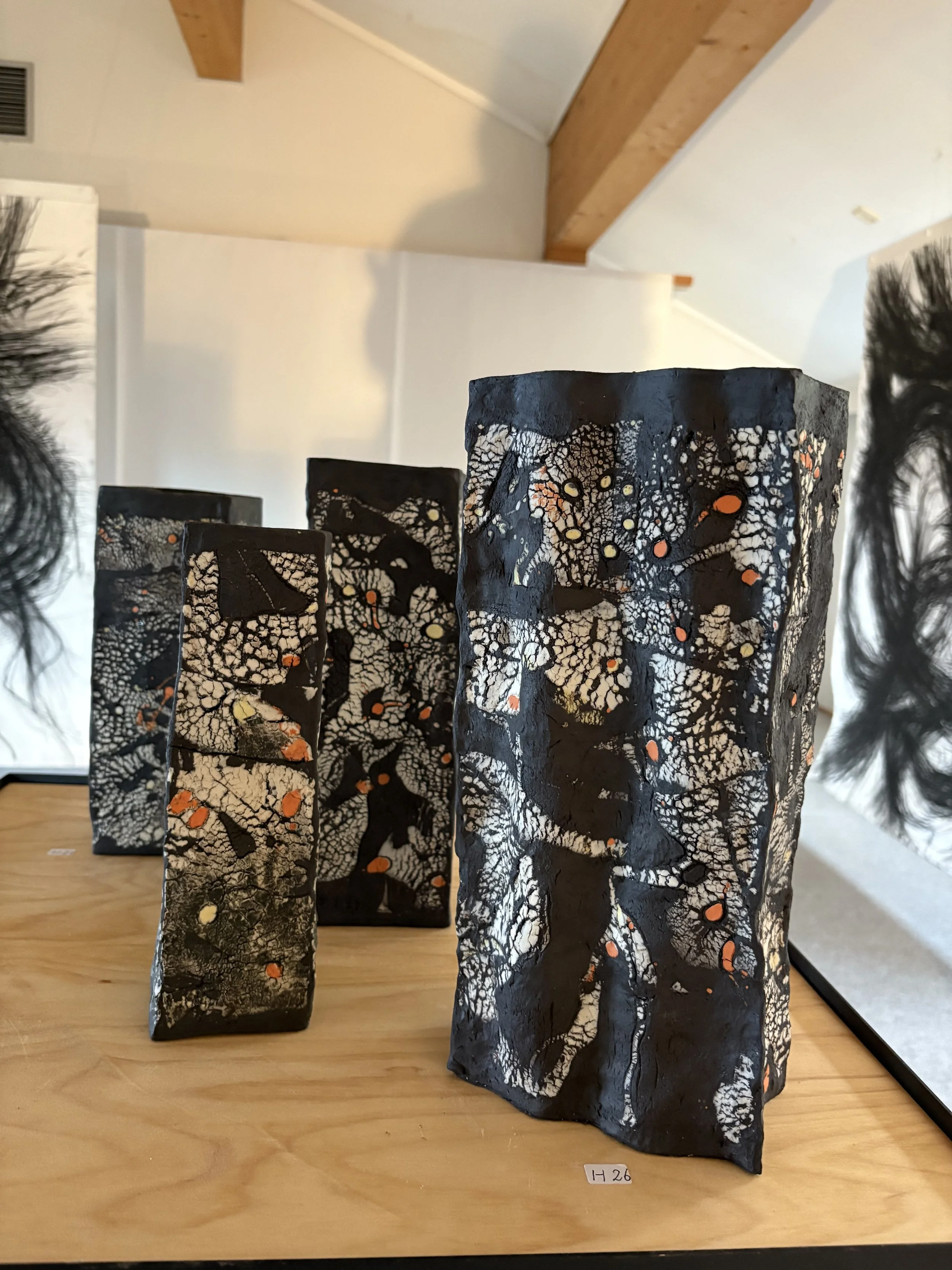 Vases, black stoneware, pink tan and white porcelain coating. Photo; Jon Solberg